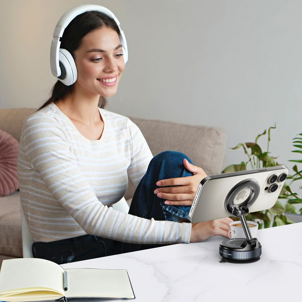 Uchwyt zapewnia mocne trzymanie telefonu dzięki wbudowanemu systemowi magnetycznemu oraz stabilnej przyssawce, gwarantuje pewne mocowanie zarówno na szybie, jak i desce rozdzielczej. Kompaktowa konstrukcja pozwala na użycie uchwytu także w innych miejscach – w kuchni, łazience czy na zewnątrz.